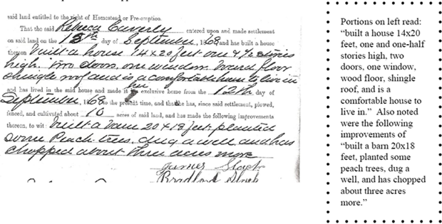 VII. CHARLES H. CAVERLY c.1824-1869 Around 1866 the family moved near Ubly in Huron County. The Huron County Deed Index shows an 1868 entry of Charles selling the NW 1/4 of the NE 1/4 of Sec. 20 in Bingham Twp. to his daughter Cinderella who had married John Thompson the previous year. On Oct. 12, 1868 Charles had paid $6 to make application #590 through the Detroit Land Office for the NW¼ of NW¼ of Section 22 in T15N R13 for 40 acres under the 1862 Homestead Act. Five months later, on Feb. 12, 1869 Charles died of consumption at the age of 44 leaving his wife Rebecca and four sons ages 2 through 14 still at home. His will is MI Probate Record #203 of Jan. 25, 1869: I Charles H. Caverly of the town of Bingham in the County of Huron and State of Michigan being of Sound Mind and memory considering the uncertainty of this frail and transitory life do therefore make order publish and declare this to be my last Will and Testament. That is to say First after all my lawful debts are paid and discharged the residue of my Estate real and personal, I give bequeath and dispose of as follows to wit: To my beloved wife the lands apertanances situated thereon viz.: The North West Quarter of the North West Quarter Section Twenty Two (22) and the South West Quarter of North East Quarter and the East half of the North West Quarter Section twenty (20), Town fifteen North of Range thirteen East, during her natural life or so long as she remains my widow. Then to divided equal among my children share and share alike accept my daughter Cindarilla who has had her share. Likewise I make constitute and appoint my wife, John Thompson, and Lewis Bonnel to be executors of this my last will and testament hereby revoking all former wills by me made. In witness whereof I have hereunto subscribed my name and affixed my seal this twenty-fifth day of January in the year of our Lord one thousand Eight and Sixty nine. In 1870, a year after Charles’ death we find a record in Huron Co., MI land book E, page 117 of 80 acres being sold by Charles to Isaac Green “by Sheriff” for the East ½ of the Northwest ¼ in Section 20 of Bingham Township. “By Sheriff” usually meant the taxes were in arrears. From the large volume of delinquent properties listed in the local newspaper of that time, it seems to have been a common practice to wait to the very last minute to pay taxes. In 1873 Rebecca followed up on the application for land with the required proof of two witnesses., James and Bradford Slack. A portion of her application shows below: Huron Co. Marriage Record #574 in Book 1, page 39 shows that Rebecca, age 49 married James R. Frank, age 57 on July 17, 1875. Residence for both was Bingham Township. The marriage did not last long because “he was mean to her” according to a granddaughter. One of her sons hitched up a wagon and went and picked up her and her personal belongings and took her back to her homestead. michigan@thecaverlys.com If you would like to view the PDF format click here